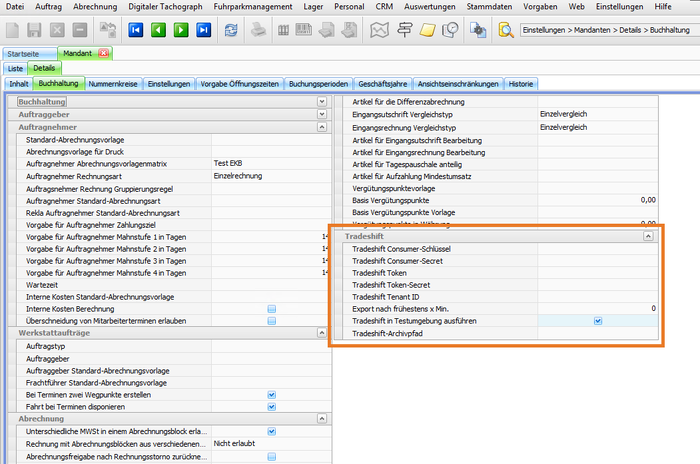 Unter der Kategorie "Tradeshift" die API Daten aus dem Tradeshift Account kopieren und diese in die jeweilig zugehörigen Felder eintragen und abspeichern. Für Testzwecke den Haken bei "Tradeshift in Testumgebung ausführen" setzen.