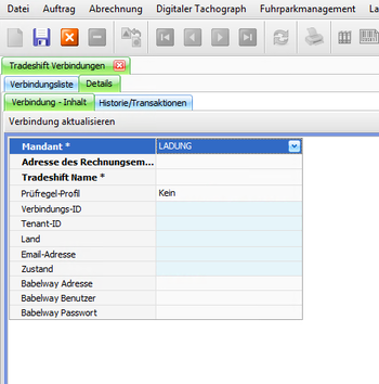 Gehen Sie auf Stammdaten > Digitaler Rechnungsversand >Tradeshift Verbindungen und legen Sie über den NEU-Button oder die Funktionstaste F2 eine neue Verbindung an.