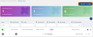 Nach Aufruf des Menüs öffnet sich die Liste der bereits vorhandenen Benutzer*innen. Über den Button Benutzer*in einladen rechts oberhalb der Liste wird ein/e neue/r Benutzer*in angelegt.