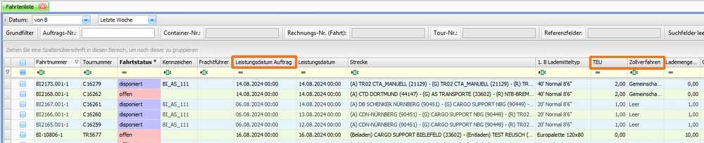 Im Menü Auftrag > Fahrtenliste wurden folgende drei Spalten neu hinzugefügt: TEU Zollverfahren Leistungsdatum Auftrag US#: 251922