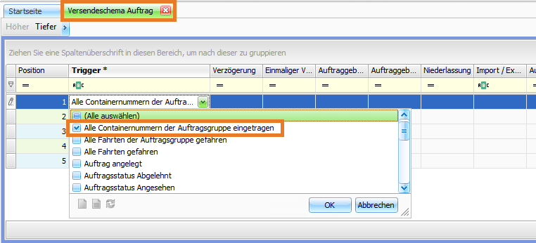 Unter Vorgaben > Track and Trace > Versendeschema Auftrag gibt es einen neuen Trigger für das Versenden der Containernummernmeldung.