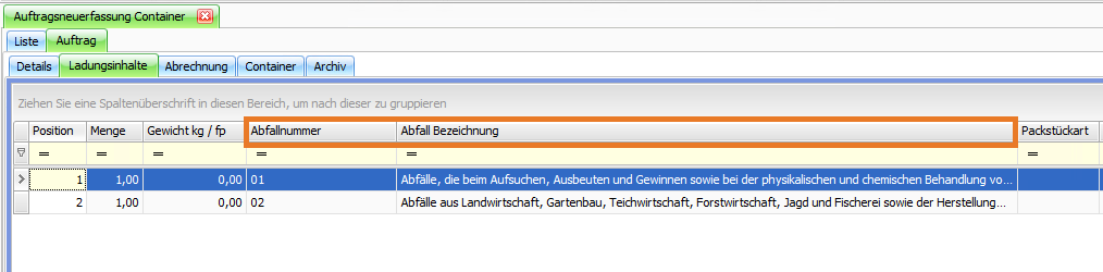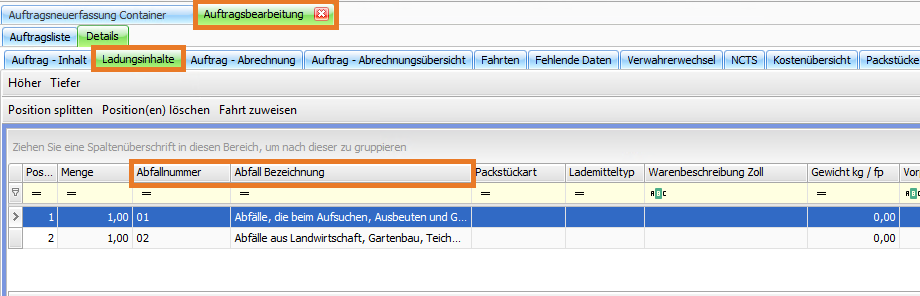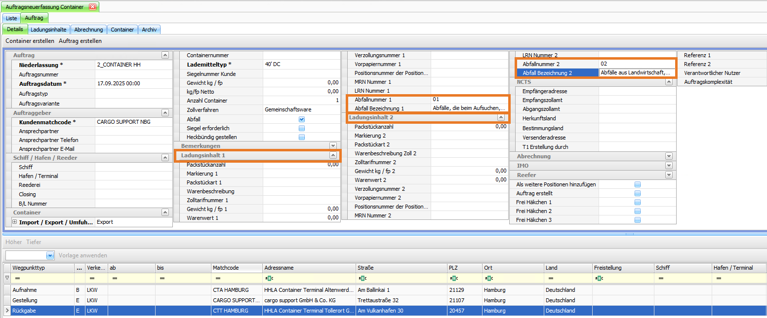 Die Felder werden jeweils für Ladungsinhalt 1 und Ladungsinhlat 2 angezeigt und beim Erstellen eines Auftrags, genau wie die vorhandenen Felder in die Spalte Ladungsinhalte übernommen.