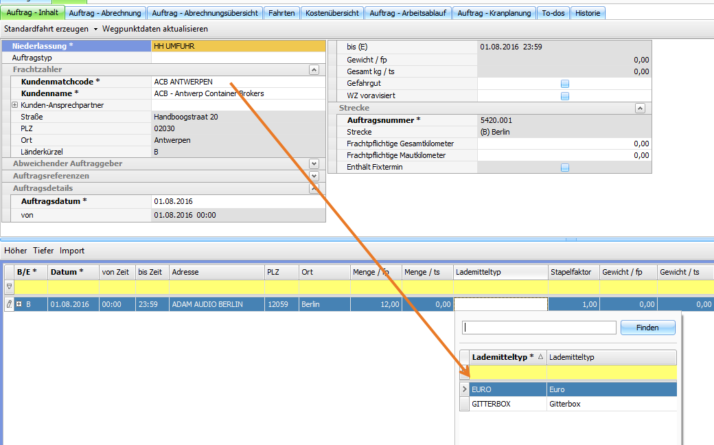 Wird dann ein Auftrag für diesen Frachtzahler erstellt und die Wegpunkte dazu erfasst, sind nur diese Lademittel im Lookup auswählbar. Die Auswahl ist demnach abhängig vom Frachtzahler und nicht von der gewählten Ladestelle.