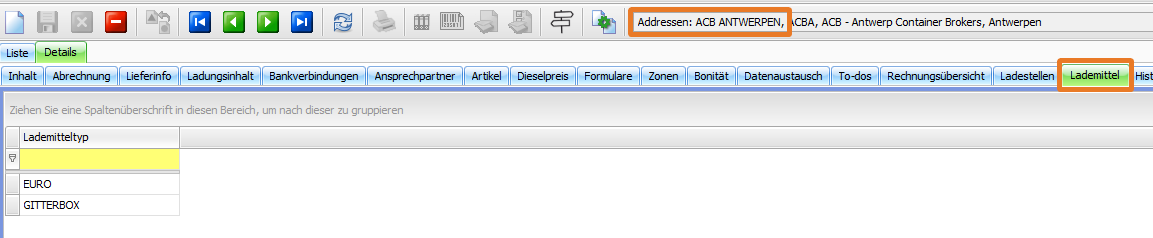 In den Stammdaten > Adressen wurde ein neuer Reiter "Lademittel" eingefügt. Hier kann eine Zuordnung der im Auftrag bei diesem Frachtzahler auswählbaren Lademittel getroffen werden.