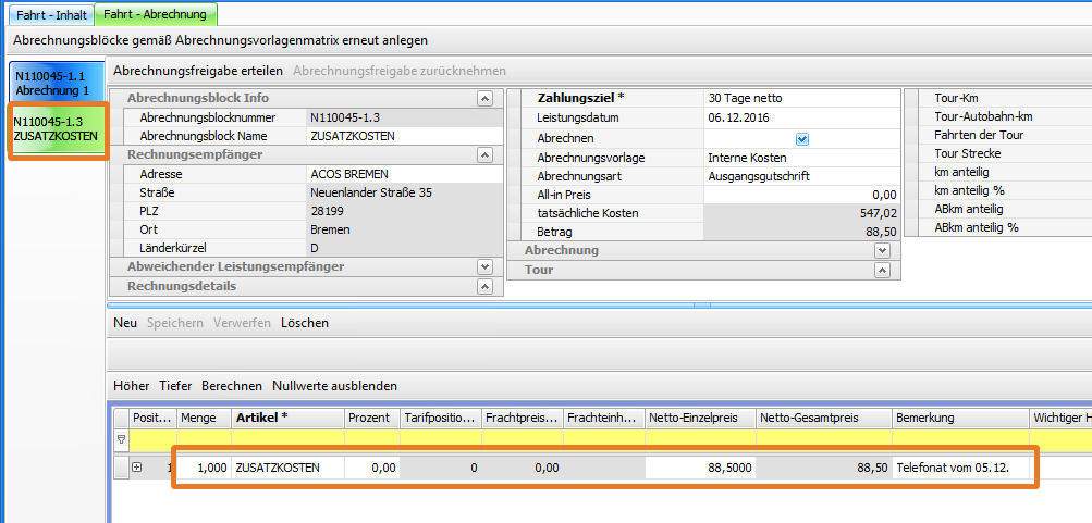 Die Bemerkung wird beim Hinzufügen in den Abrechnungsartikel in das Feld Bemerkung übernommen.