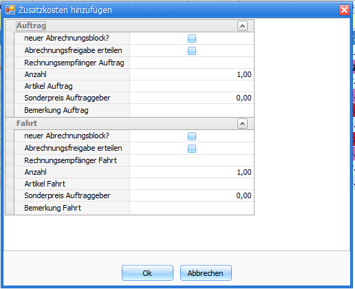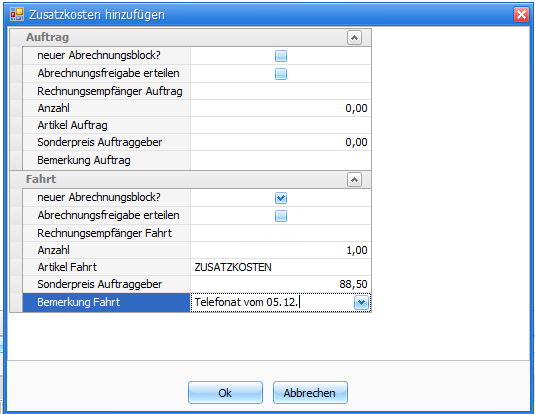 Im Dispoplan in der Funktion 'Zusatzkosten hinzufügen' wurde eine Änderung des Fensteraufbaus nötig, da hier für Auftrag und Fahrt jeweils die Anzahl und ein Bemerkungsfeld hinzugefügt wurden.