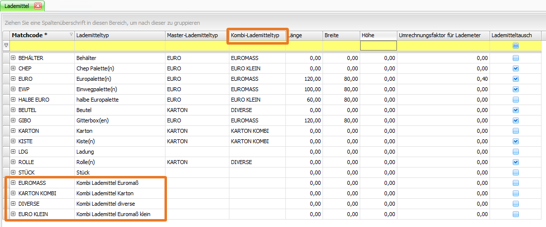 In den Vorgaben > Auftrag > Lademittel wurde eine neue Spalte "Kombi-Lademitteltyp" eingefügt.