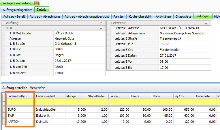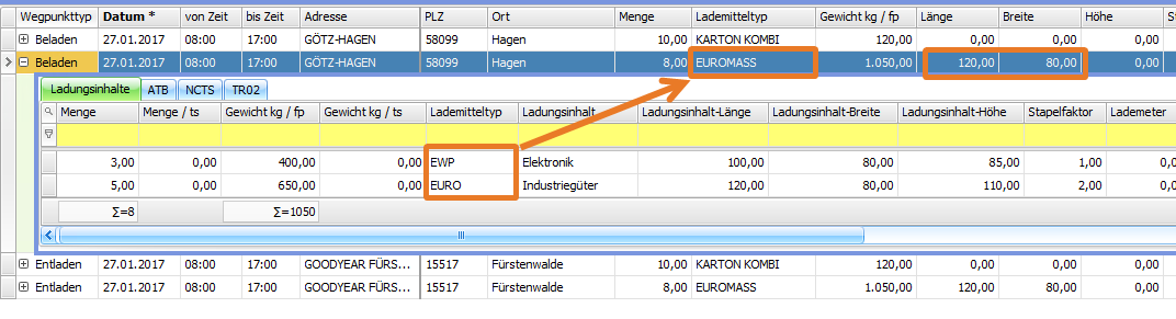 Hauptsächlich dient dieser Kombi-Lademitteltyp zusammen mit dem Master-Lademitteltyp zur richtigen Anlage und Befüllung der Wegpunkte und Unterwegpunkte bei Auftragserzeugung aus kundenspezifischen Importen und für Auftragserzeugung aus Auftragsvorlagen Reiter Ladungen (Auftrag aus Ladung erzeugen).
