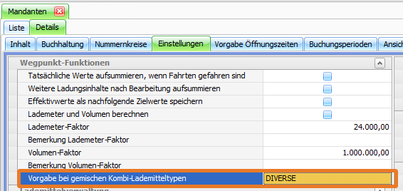 In den Einstellungen > Mandant > Einstellungen in der Kategorie 'Wegpunkt-Funktionen' wurde ein neues Feld "Vorgabe bei gemischten Kombi-Lademitteltypen" eingefügt. Hier legt man den Lademitteltyp fest, der im Wegpunkt eingestellt wird, wenn im Unterwegpunkt Lademittel mit verschiedenen Komib-Lademitteltypen angelegt wurden.