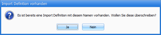 Klickt man auf "Ja", wird die bestehende Import-Definition überschrieben, so dass sichergestellt ist, dass jeder Name einer Import-Definition eindeutig ist.
