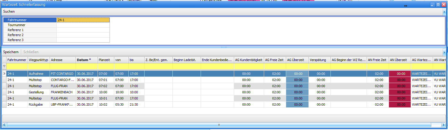 Im oberen Fensterteil befinden sich Schnellsuchfelder, die zur Suche der Fahrt (Suchen mit ENTER) genutzt werden können. Gleichzeitig ist es aber auch möglich, auf der gewünschten Fahrt mit Rechtsklick das Fenster aufzurufen. Dann wird direkt diese Fahrt in der Maske angezeigt.