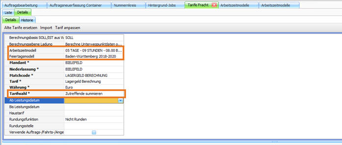 Hinweis: Das Feld Tarifwahl wird für die Lagergeldberechnung ignoriert. Bei der Lagergeldberechnung werden immer alle gefundenen Positionen, die die oben genannten Felder korrekt gefüllt haben, angewendet.