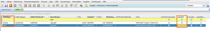 Anlegen der entsprechenden Artikel, mit denen man dieses „Lagergeld“ berechnen möchte. Hier im Beispiel die Artikel „Lagergeld“ erfasst. Bei diesen Artikeln ist ebenfalls das Häkchen bei „Lagergeld“ zu setzten (Pfad: Vorgaben > Abrechnung > Abrechnungsartikel)