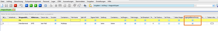 - Dem Wegpunkttyp, an dem eine Lagergeldberechnung stattfinden soll, muss das Häkchen „Lagergeldberechnung“ erhalten. In diesem Beispiel bei Wegpunkttyp „Inlandsterminal“. (Pfad: Vorgaben > Auftrag > Wegpunkttypen)