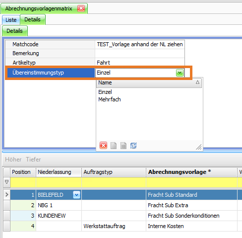 Der 1. Treffer ist die Position 2, so dass die Vorlage "Fracht Sub Extra" eingetragen wird.