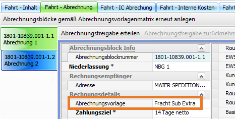 Wenn man nun einen identischen Auftrag mit der Strategie "Mehrfach" anlegt, werden so viele Abrechnungsblöcke angelegt, wie es Treffer gibt: im Beispiel also 2.