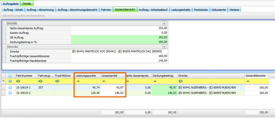 Für die Verteilung der Umsatzanteile auf die Fahren eines Auftrags wurde eine neue Variante hinzugefügt – "Verteilung nach den Leistungspunkten aller Fahrten".
