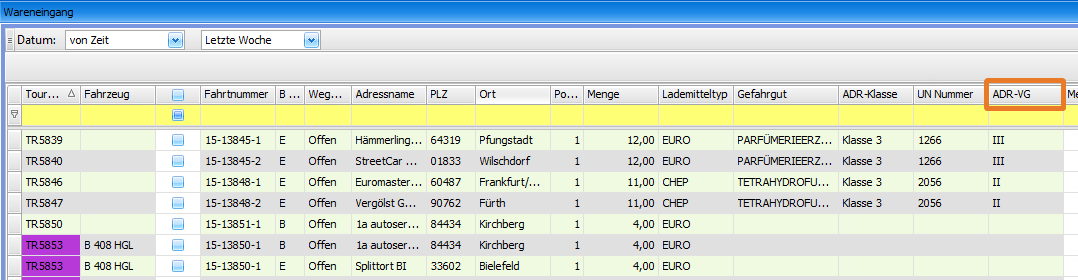 US#: 132082 Im Dispoplan im Fenster "Wareneingang" wurde das Feld 'ADR-VG' aus den Fahrt-Wegpunkten ergänzt.