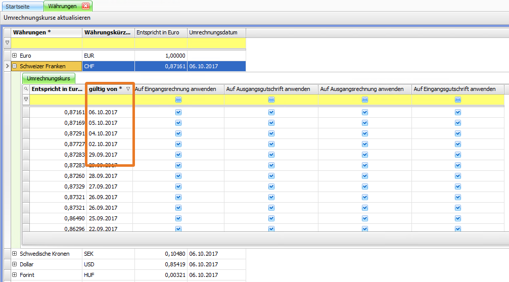 Der neueste Wechselkurs wird immer auf der Hauptebene angezeigt, klappt man die Unterebene auf, findet man hier die Historie.