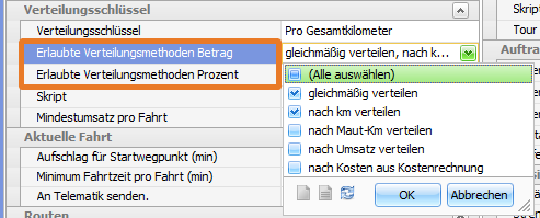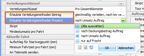 Für die Funktion "Frachtkostenumlage" in der Auftrags- und Fahrtenliste wurde es ermöglicht, dass man die für den User zur Verfügung stehende Auswahl der Verteilung nun fixieren kann.