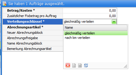 Auftrags- oder Fahrtenliste -> Rechtsklick-Menü -> Frachtkostenumlage -> Verteilung nach Betrag