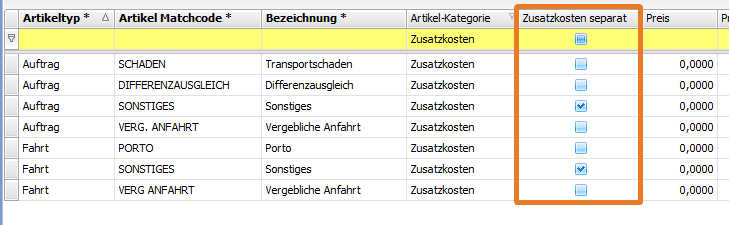 In den Vorgaben > Abrechnung > Abrechnungsartikel und in den Stammdaten > Adressen > Inhalt > Artikel wurde eine neue Spalte hinzugefügt: Zusatzkosten separat
