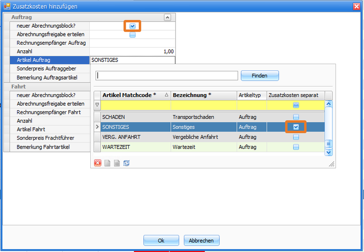 Wenn Sie dann im Dispoplan die Funktion "Zusatzkosten hinzufügen" und dort einen Artikel auswählen, der diesen Haken in den Einstellungen gesetzt hat, dann prüft das System, ob bei der Adresse oder in den Vorgaben der Haken gesetzt ist und falls ja, wird der Haken "neuer Abrechnungsblock?" automatisch gesetzt.