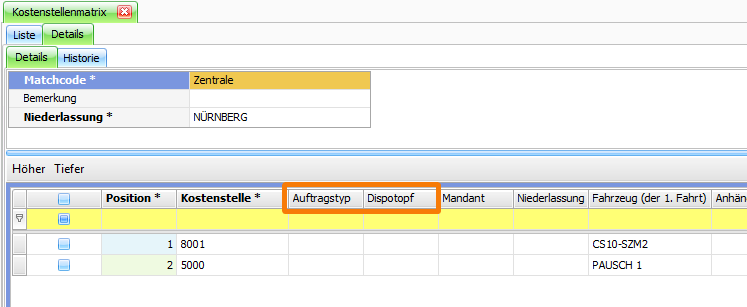 Neue Spalten in Kostenstellenmatrix (CR 151380)