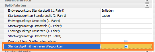 Im Menü Einstellungen > Mandanten > Einstellungen wurde im Bereich "Split-Fahrten" ein neues Häkchenfeld ergänzt: "Standardsplit mit mehreren Wegpunkten".
