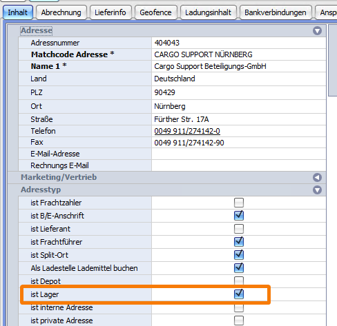 Eine Adresse kann einem Lagerbereich nur zugeordnet werden, wenn sie in den Stammdaten > Adressen das Häkchen "Ist Lager" gesetzt hat.