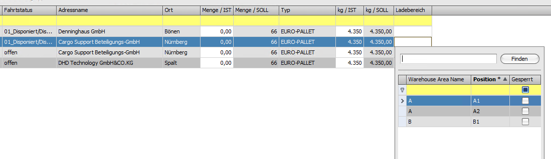 Eine Auswahl des Ladebereichs ist nur bei Ladungsinhaltspositionen (im Unterwegpunkt erfasst) und den Adressen möglich, die eine Zuordnung zu Lagerbereichen haben. Bei Ladungen, die nur auf dem Wegpunkt erfasst sind, kann das Lookup nicht geöffnet werden.