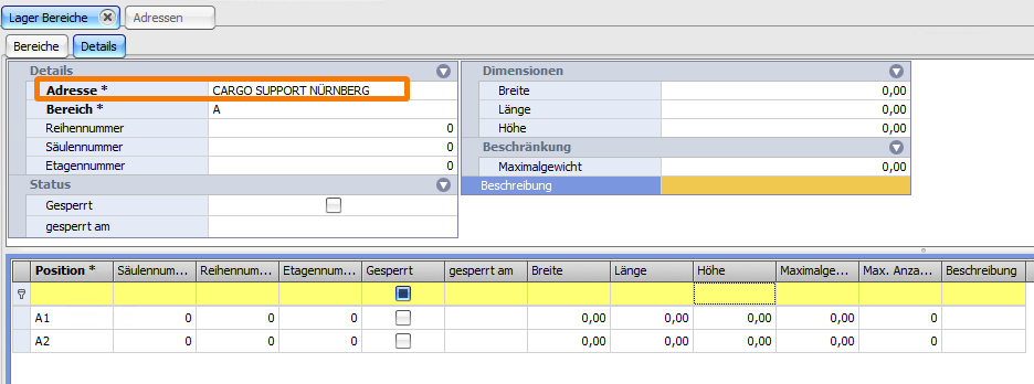 In den Details der Lagerbereiche können genauere Informationen hinterlegt werden. Hier wird auch festgelegt, welcher Adresse dieser Lagerbereich zugeordnet ist.