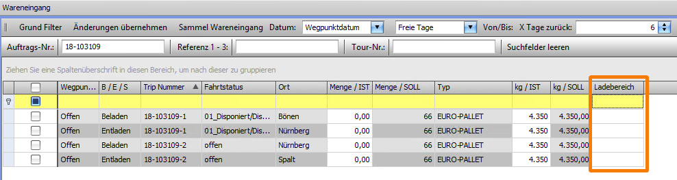 Im Dispoplan wurde das Fenster Wareneingang um die Spalte Ladebereich erweitert.