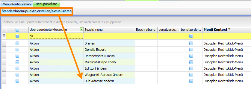 Hier üben den Button "Standardmenüpunkte erstellen/aktualisieren" den Menüpunkt hinzufügen.