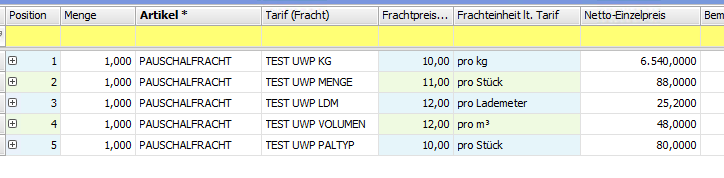 Die Logik bei der Preisberechnung über Tarife wurde erweitert. Es werden jetzt zusätzlich die Werte aus den Ladungsinhalten (Unterwegpunkt) berücksichtigt. Das heißt: wenn Ladungsinhalte vorhanden sind, werden diese Angaben im Tarif berücksichtigt. Sind keine Ladungsinhalte vorhanden, werden wie gewohnt die Werte aus den Wegpunkten herangezogen.