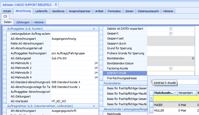 US#: 162860 Im Menü "Stammdaten > Adressen" gibt es im Reiter "Abrechnung" das EDIFACT-Profil: Dieses Feld wurde als Spalte in folgender Auswertung hinzugefügt: „Auswertungen > Abrechnung > Adress-Abrechnungsinfo".