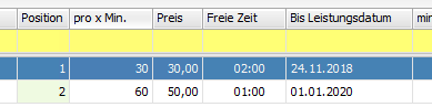 Für die Fahrt mit dem Leistungsdatum 21.11 wird die 1. Position der Wartezeitmatrix gefunden (Bis Leistungsdatum 24.11.2018). Daher wird eine freie Zeit von 2 Stunden eingetragen und ein Preis von 30€ je 30 Minuten.