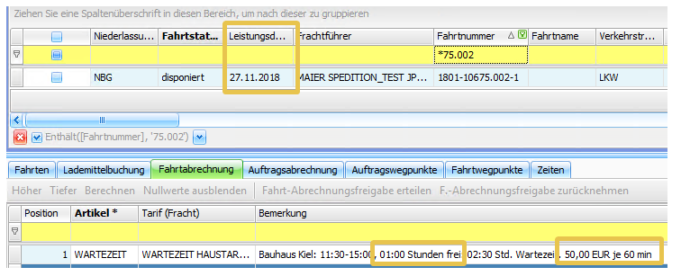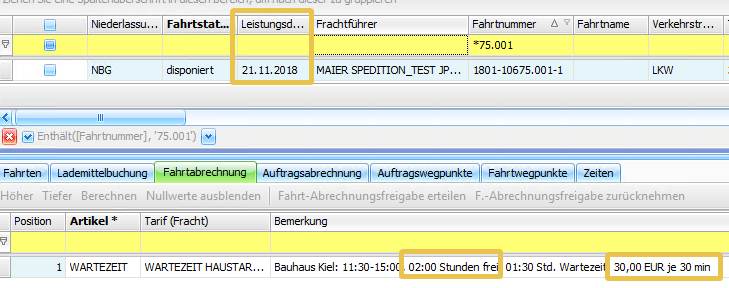 Wenn man nun Fahrten mit identischen Ladezeiten, aber jeweils unterschiedlichem Leistungsdatum der Fahrten erfasst, z.B. 21.11. und 27.11, werden unterschiedliche Wartezeitkosten automatisch berechnet.