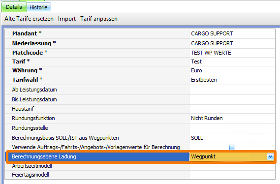 Aufgrund der Änderung in der Logik der Preisberechnung mit Ladungsinhalten wurde eine weitere Ergänzung nötig. In den Vorgaben > Abrechnung > Tarife im oberen Bereich ist eine weitere Auswahl hinzugekommen: Berechnungsebene Ladung.