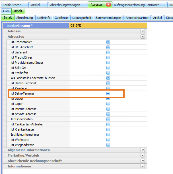 In den Adressen, die als Bahn-Terminal verwendet werden, muss der Haken bei "ist Bahn-Terminal" gesetzt sein. (nur Adressen mit diesem Haken können im Tarif ausgewählt werden)