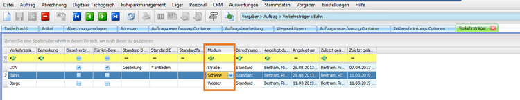 Der Tarif prüft nicht den Verkehrsträger, sondern das zugeordnete "Medium" zu dem ausgewählten Verkehrsträger. Die Zuordnung wird über Vorgaben > Auftrag > Verkehrsträger vorgenommen. Das Medium ist fest in der Software hinterlegt, es können nur diese 4 bestehenden Medien ausgewählt werden: Straße, Schiene, Wasser, Luft.
