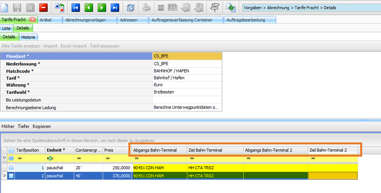 Vorgaben > Abrechnung > Details > Tarife Fracht