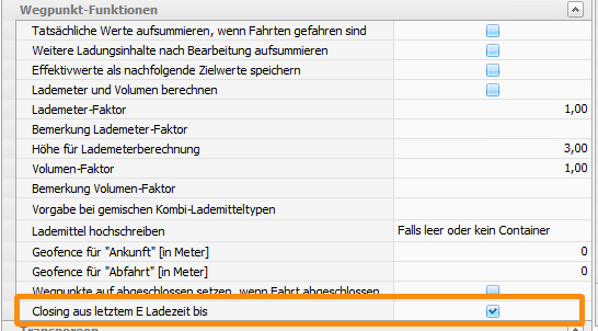 In den Einstellungen > Mandanten > Details > Einstellungen bei den Wegpunkt-Funktionen ist die neue Einstellung Closing aus letztem E Ladezeit bis ergänzt worden. Wird dies aktiviert, wird die Ladezeit bis aus dem letzten Wegpunkt in den Auftragskopf in Ladeschluss Schiff übernommen.