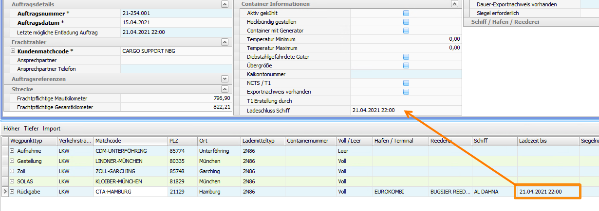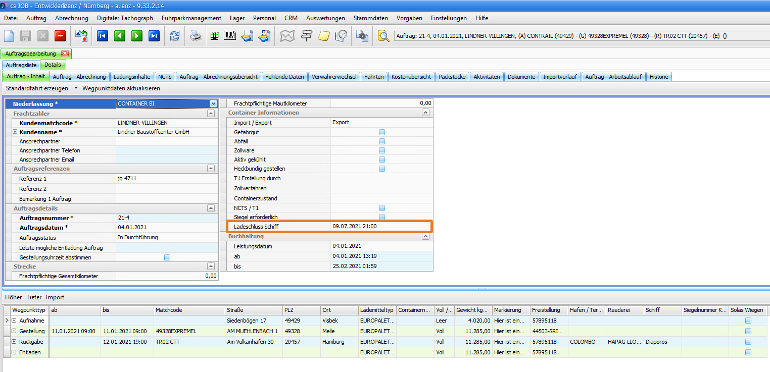 In cs JOB unter Auftrag > Auftragsbearbeitung > Details > Auftrag-Inhalt ist im Bereich Container Informationen ein weiteres Feld Ladeschluss Schiff (umgs. Closing) hinzugekommen.