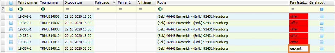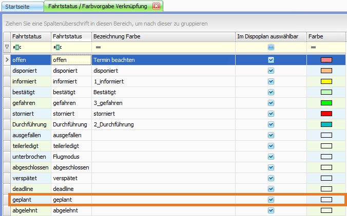 Im Hauptmenü unter Vorgaben > Dispoplan > Fahrtstatus / Farbvorgabe Verknüpfung wurde ein neuer Fahrtstatus hinzugefügt: "geplant".