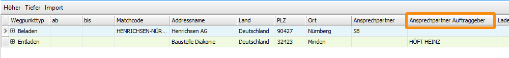 In Auftrag > Auftragsbearbeitung wurde in den Wegpunkten des Auftrags und der Fahrt jeweils eine weitere Spalte Ansprechpartner Auftraggeber eingefügt. Damit ist ein Ansprechpartner abhängig vom Auftraggeber auswählbar.
