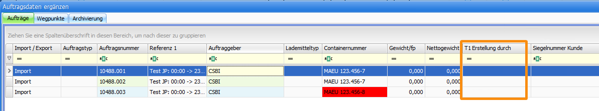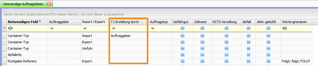 In den Vorgaben > Fehlende Auftragsdaten > Notwendige Auftragsdaten wurde eine neue Spalte T1 Erstellung durch eingefügt, mit der gekennzeichnet werden kann, wann Zolldokumente benötigt werden.