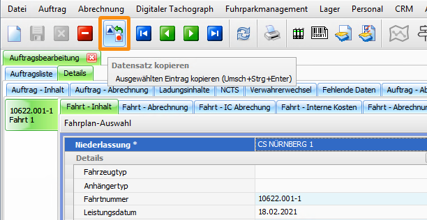 In der Auftragsbearbeitung > Auftrag Inhalt > Fahrten wurde die Kopierfunktion angebunden, sodass nun auch einzelne Fahrten innerhalb des Auftrags durch Kopieren dupliziert werden können.