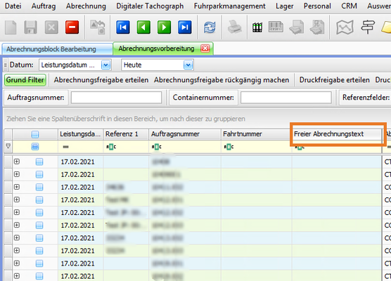 Nur lesen: Im Menü Abrechnung > Abrechnungsvorbereitung in der Spalte Freier Abrechnungstext.