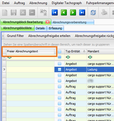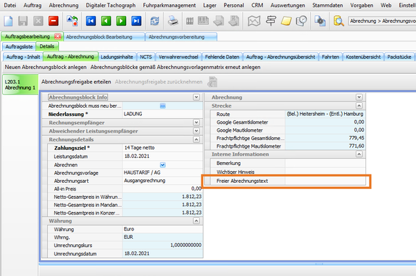 Nur lesen: Im Menü Abrechnung > Abrechnungsblock Bearbeitung in der Spalte Freier Abrechnungstext.